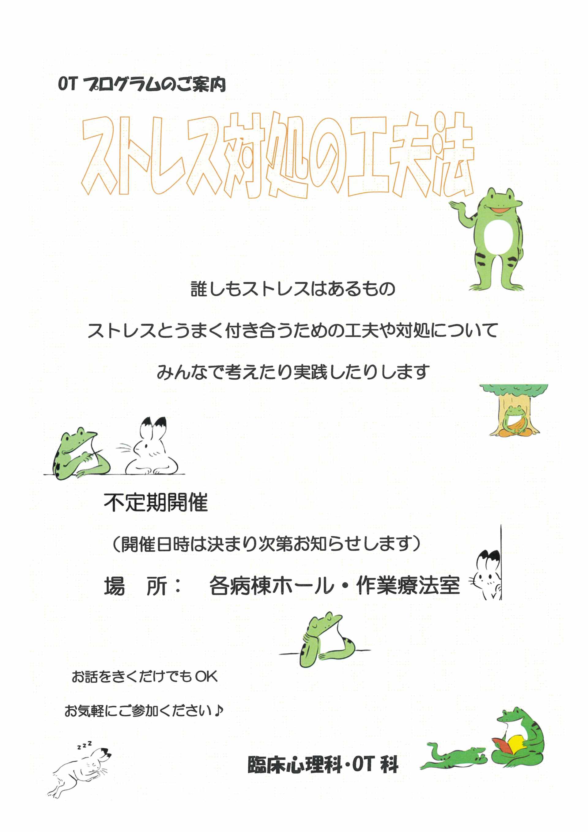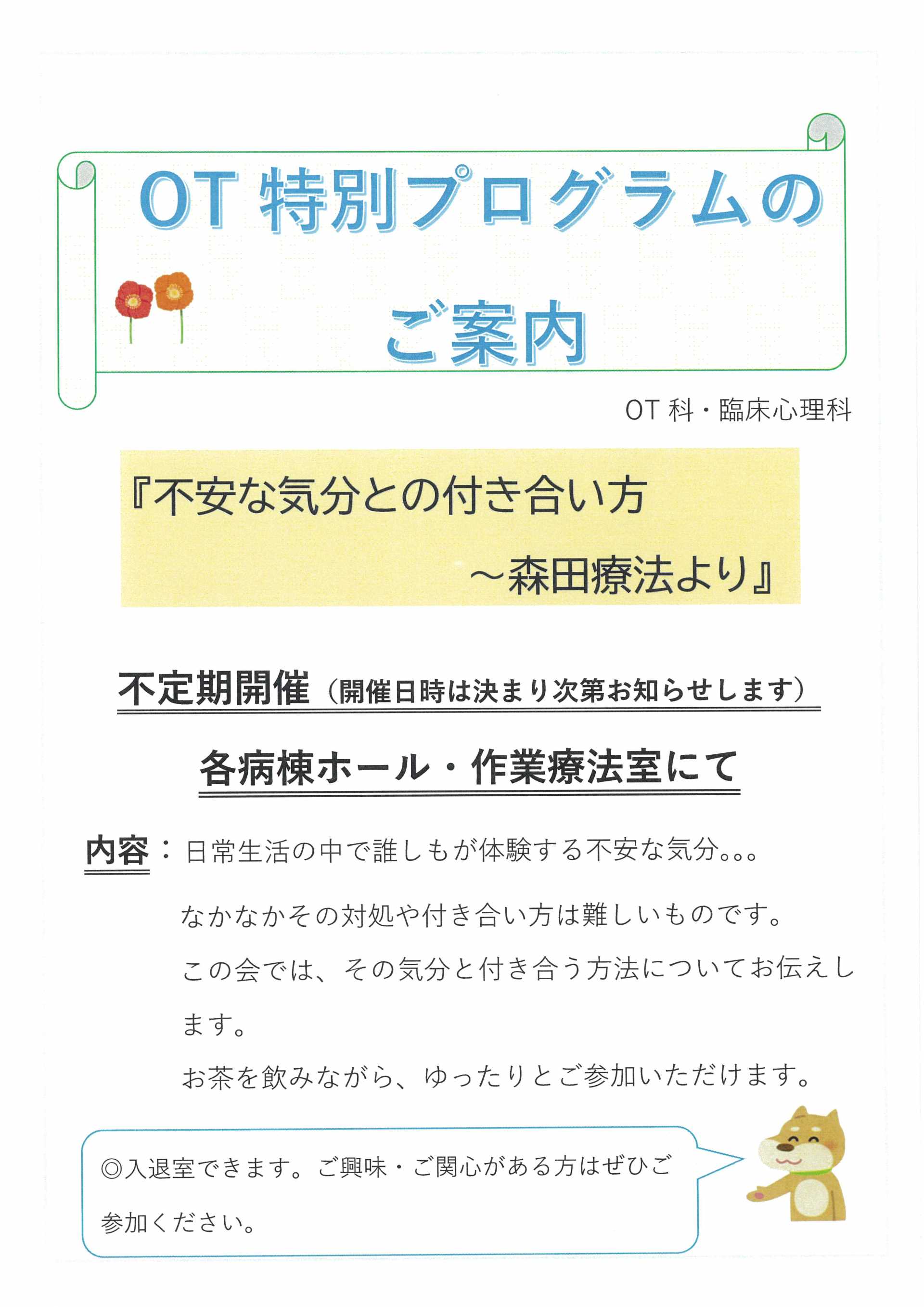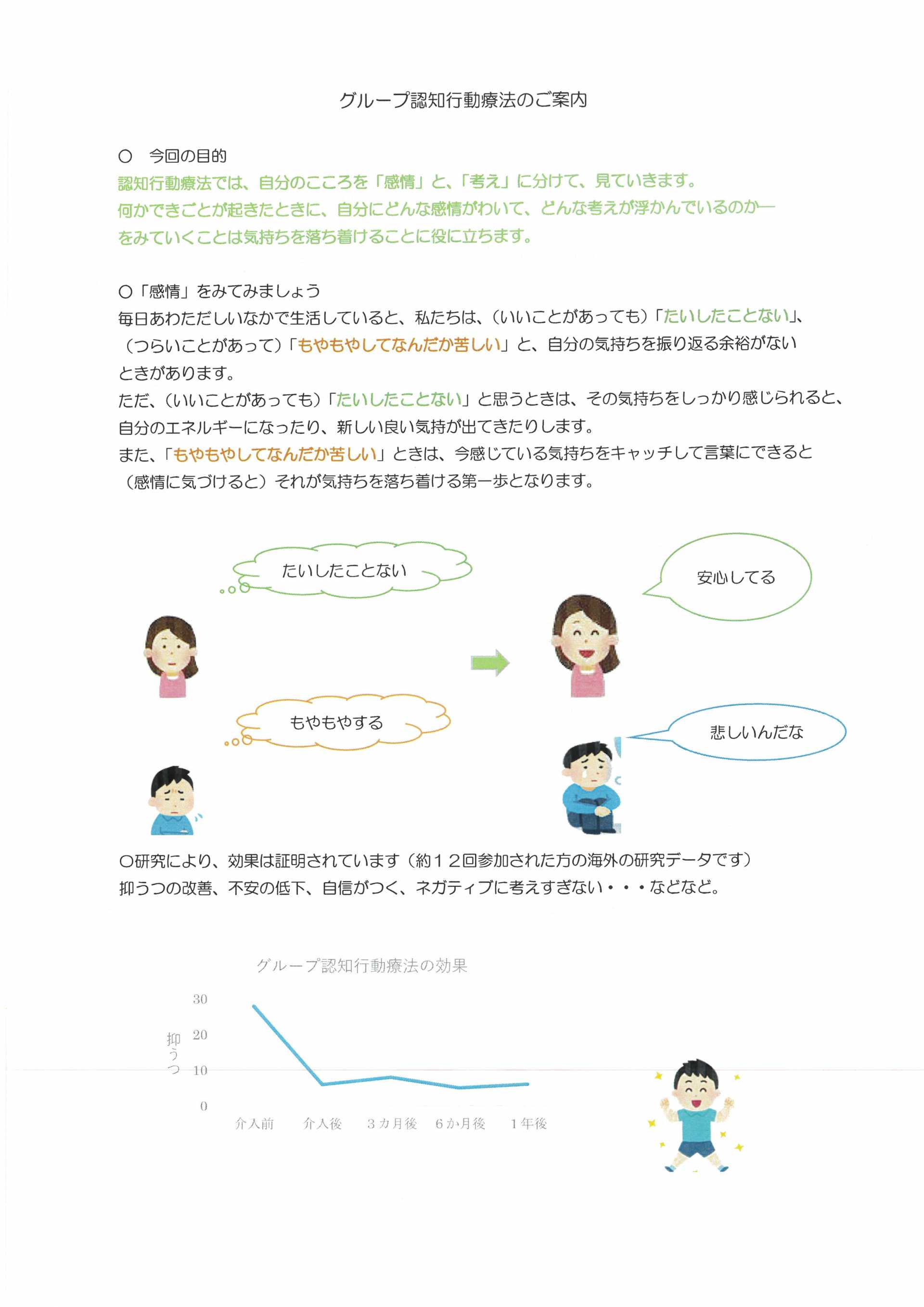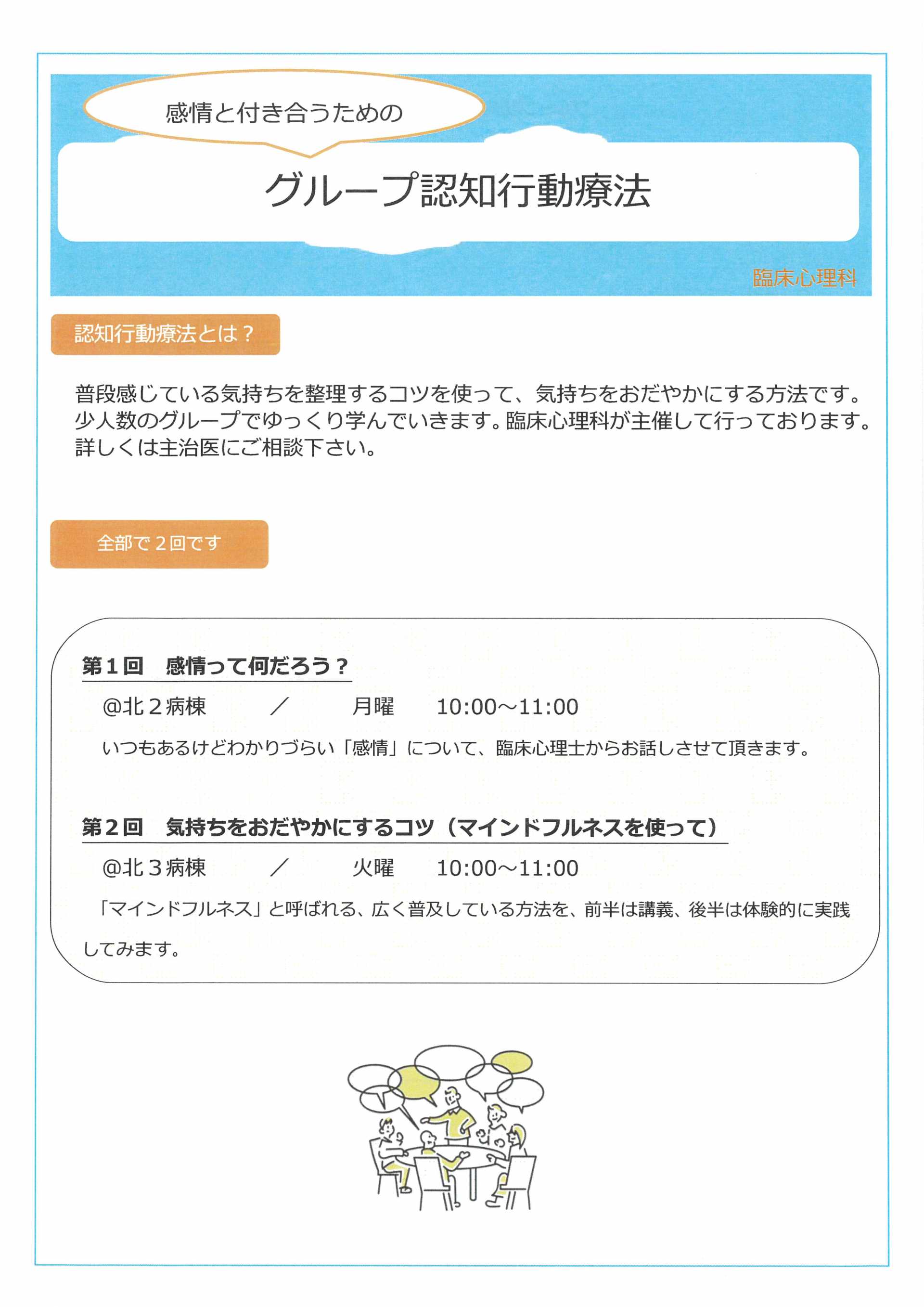 - 感情と付き合うためのグループ認知行動療法(参加希望の方は主治医にご相談ください。)